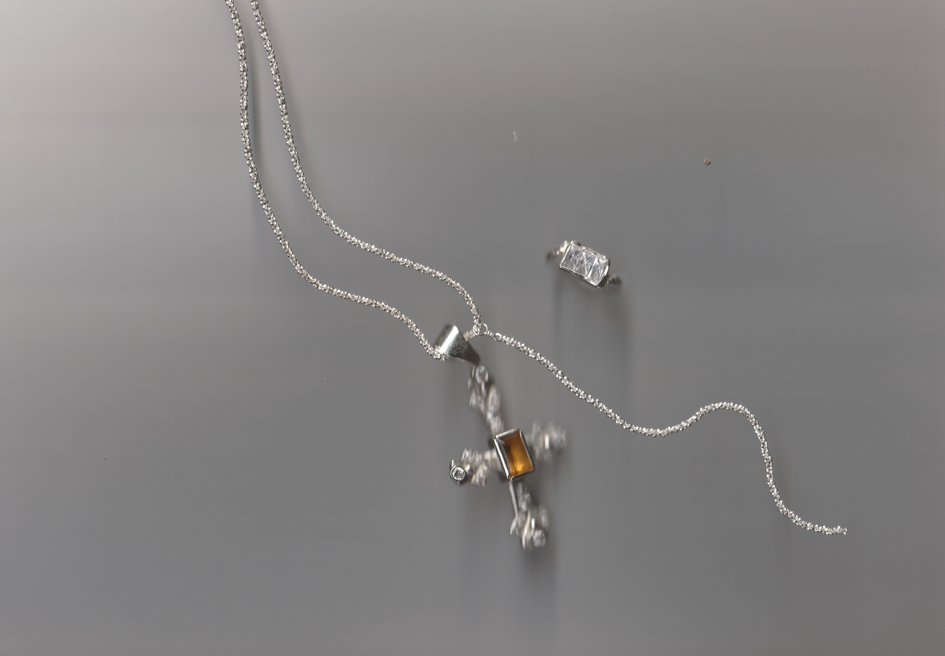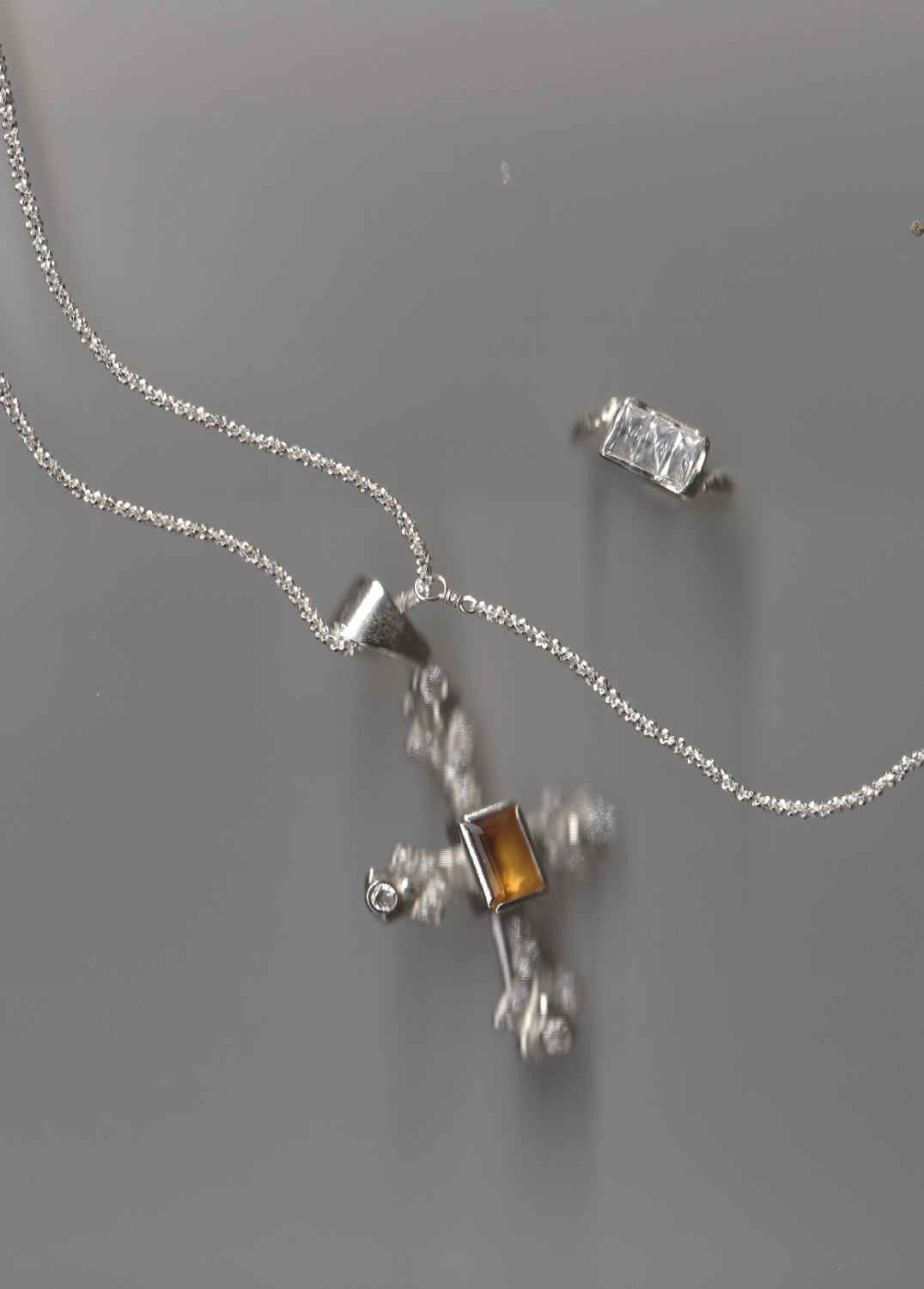 Emerald cut yellow topaz, gypsy set zirconia, 925 sterling silver.